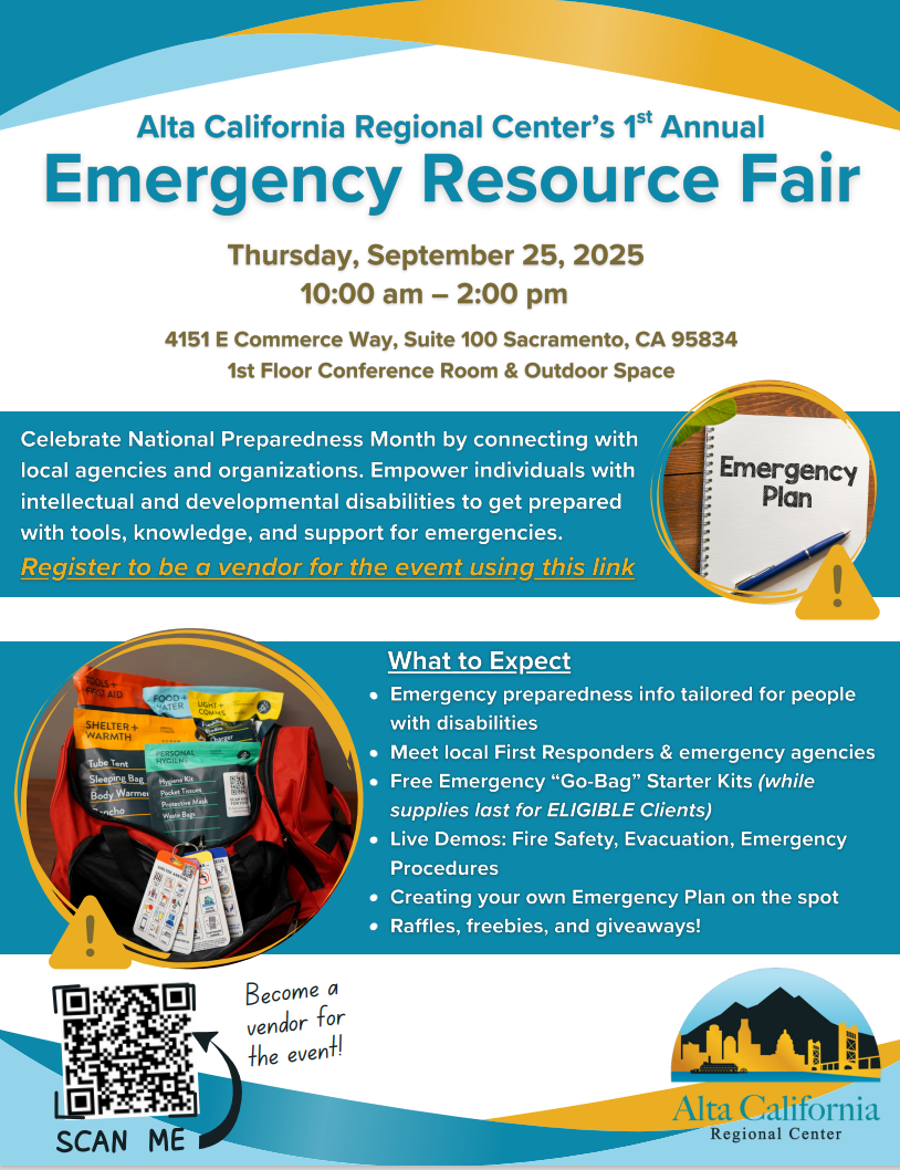 Join a SMRC team to staff a table at the Alta CA Regional Center's first Emergency Resource Fair! Distribute emergency preparedness information to people with intellectual and developmental disabilities and their families.