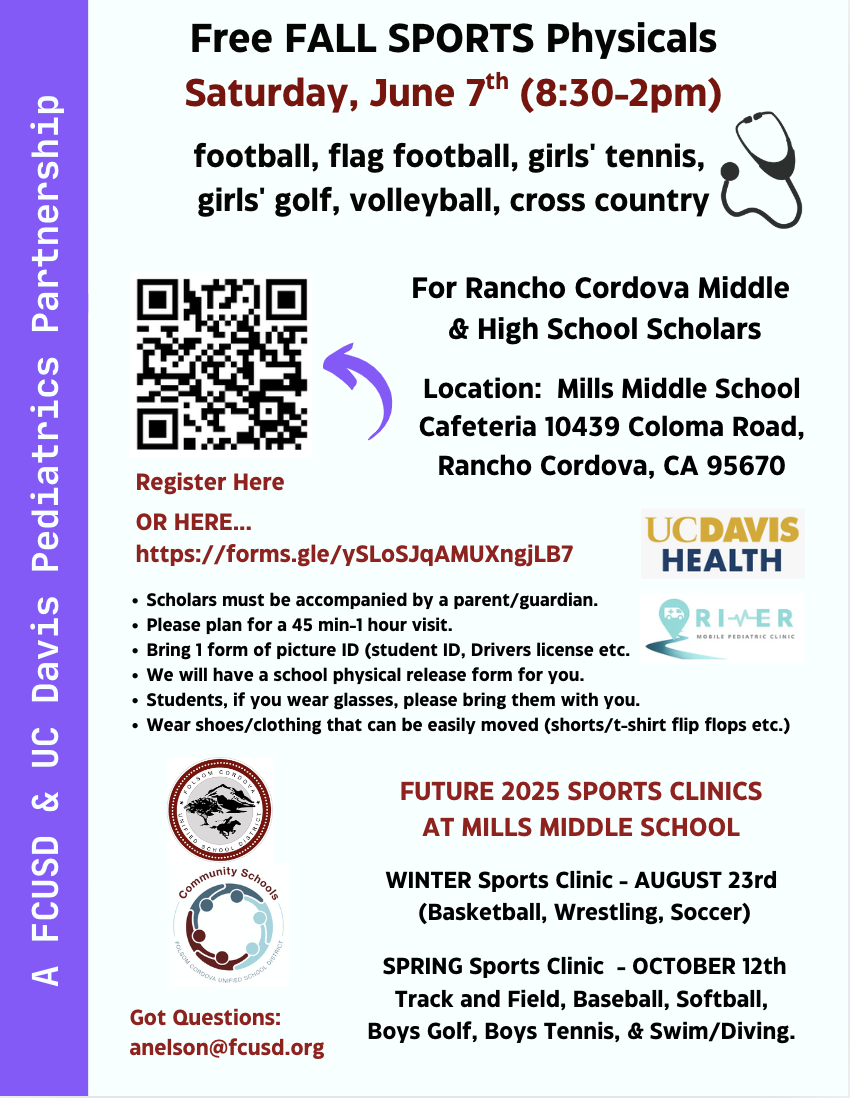MDs and NPs needed to assist with an upcoming sports physical clinics for Folsom Cordova Unified School District's - Mills Middle School in Rancho Cordova. Physicals are for 6th - 12th grade students. Shifts are from 8 a.m. - noon. Additional female volunteers needed. Date and time for this clinic is different than previously listed on the flier. Snacks and lunch provided for volunteers. Please bring a stethoscope, reflex hammer, and flashlight. A checklist for physicals will be provided.